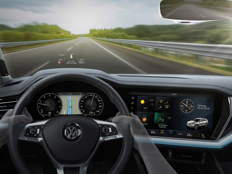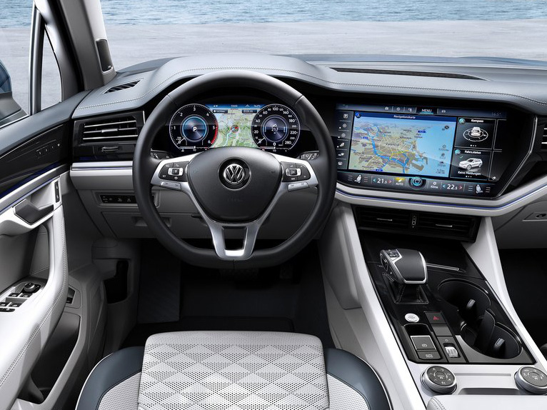 Yeni Touareg’de VW’nin “Innovision Cockpit” adını verdiği kokpit ile karşılaşıyoruz. Touareg’de direksiyon başına geçtiğimizde bizleri ilk olarak 12 inç boyutunda, diğer VW modellerindende aşina olduğumuz dijital gösterge paneli karşılıyor. Multimedya kısmında ise “Discover Premium” adı verilen sistem, 15 inçlik ekran boyutuyla kendisine şoföre dönük bir biçimde yer edinmiş ve klima kontrolleri bu ekranın alt kısmına yerleştirilmiş. Innovision Cockpit ayrıca kablosuz şarj desteği, App Connect (Mirror Link, Apple CarPlay, Android Auto) desteği, tabletlerle uyumlu Media Control fonksiyonu, 4 adet USB girişi (2 tanesi arka kısımda sadece şarj desteği için) ve 8 cihaza kadar Hotspot desteği sunuyor. Opsiyonel olarak Head-Up Display de alınabiliyor.