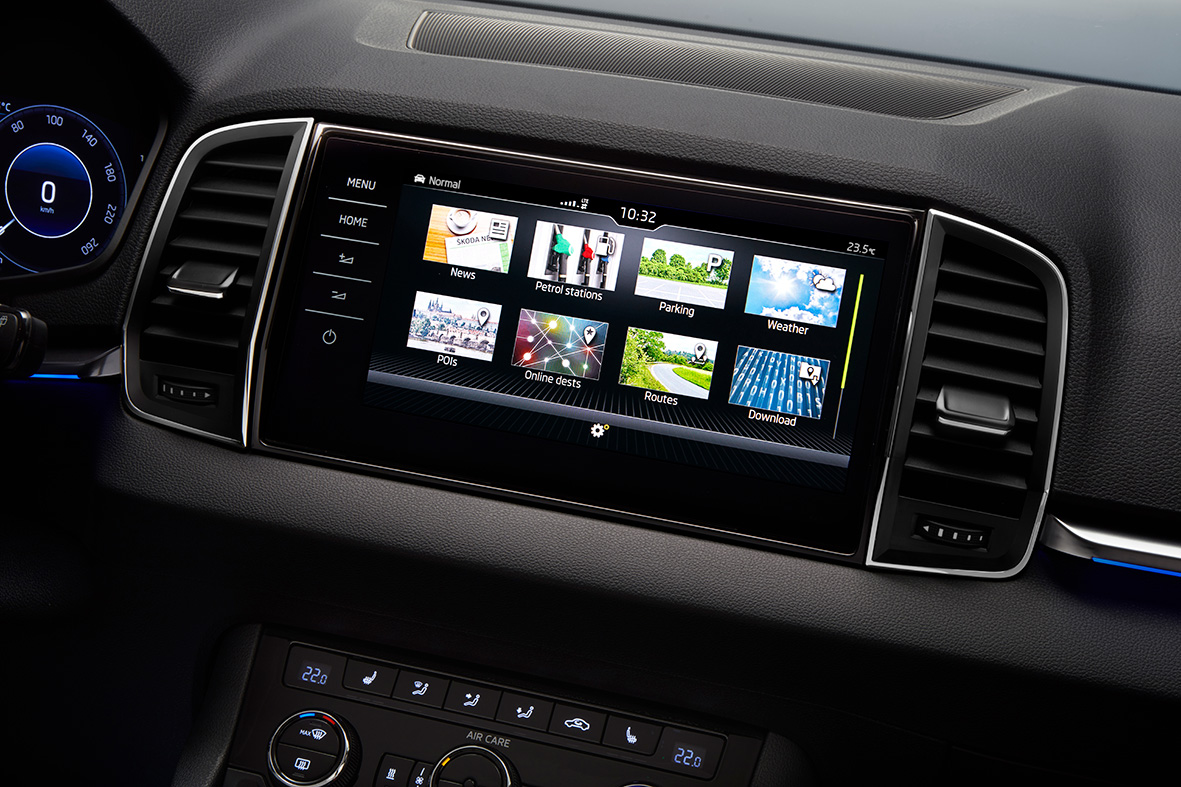 Karoq’un kabininde teknoloji konuşuyor. VW grubunun ikinci jenerasyon dokunmatik ekranıyla donatılan otomobilde üst iki multimedya paketi Columbus ve Amundsen’de Wi-Fi bağlantısı bulunuyor. Columbus’ta ayrıca bir LTE modülü yer alıyor. Araç içi internet dağılımı sayesinde, Karoq içindeki yolcular mümkün olan en yüksek hızda internet kullanabiliyorlar. Mobil telefon bağlantı sistemi Skoda Connect iki kategoriye bölünüyor; bilgi ve navigasyon. Ayrıca 2018’de devreye girecek sesli bağlantı ve yardım sistemi CareConnect ve Skoda Connect aplikasyonlarıyla tamamlanacak Bu sayede cep telefonundan aracınızı uzaktan kontrol edebilecek, ayarlarını yapabilecek ve en son park ettiğiniz yeri görebileceksiniz. Apple Car play, Android Auto ve Mirror Link bağlantılarının yanında opsiyonel kablosuz şarj imkanı da Karoq’un özellikleri arasında.